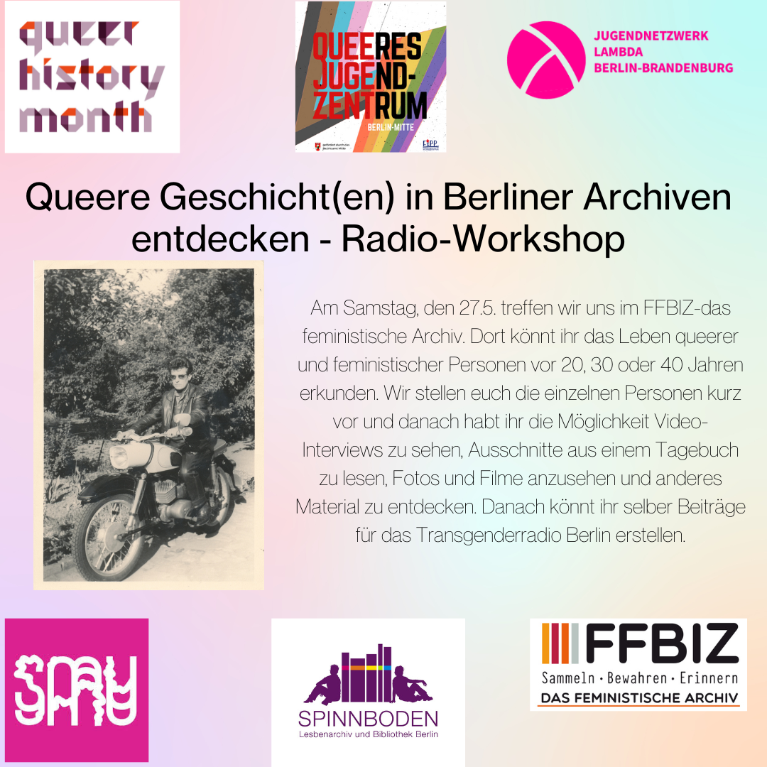 Im Rahmen des Queer History Month veranstalten wir gemeinsam mit dem Spinnboden Lesbenarchiv, dem Schwulen Museum, dem Queeren Jugendzentrum Berlin-Mitte und dem Jugendnetzwerk Lambda Berlin-Brandenburg eine Workshop-Reihe unter dem Titel „Queere Geschichte(n) in Berliner Archiven entdecken“.