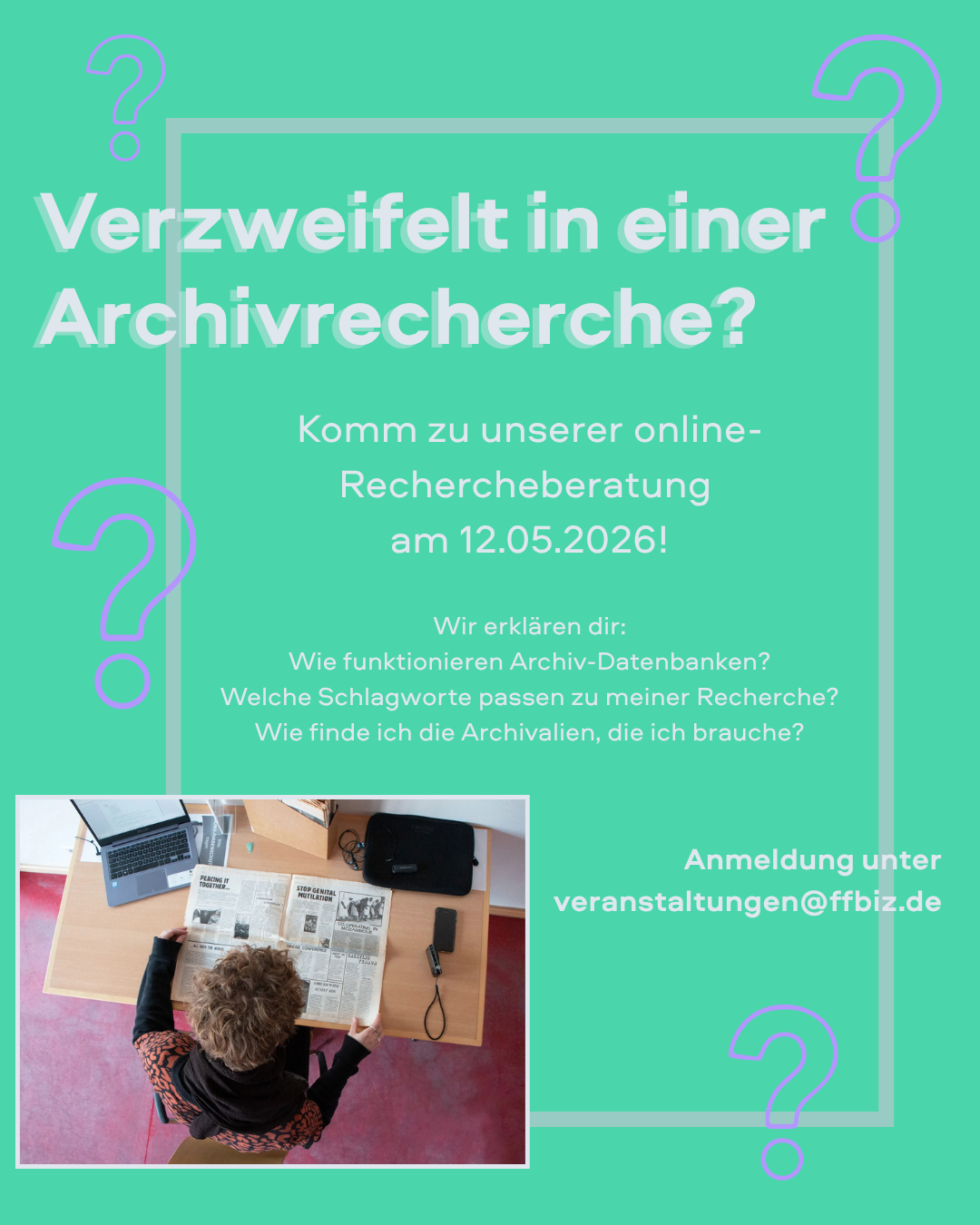 Am 12.05. bieten wir von 16-17 Uhr einen Online-Termin zur Rechercheberatung an. Dort unterstützen wir dich bei deiner individuellen Recherche.