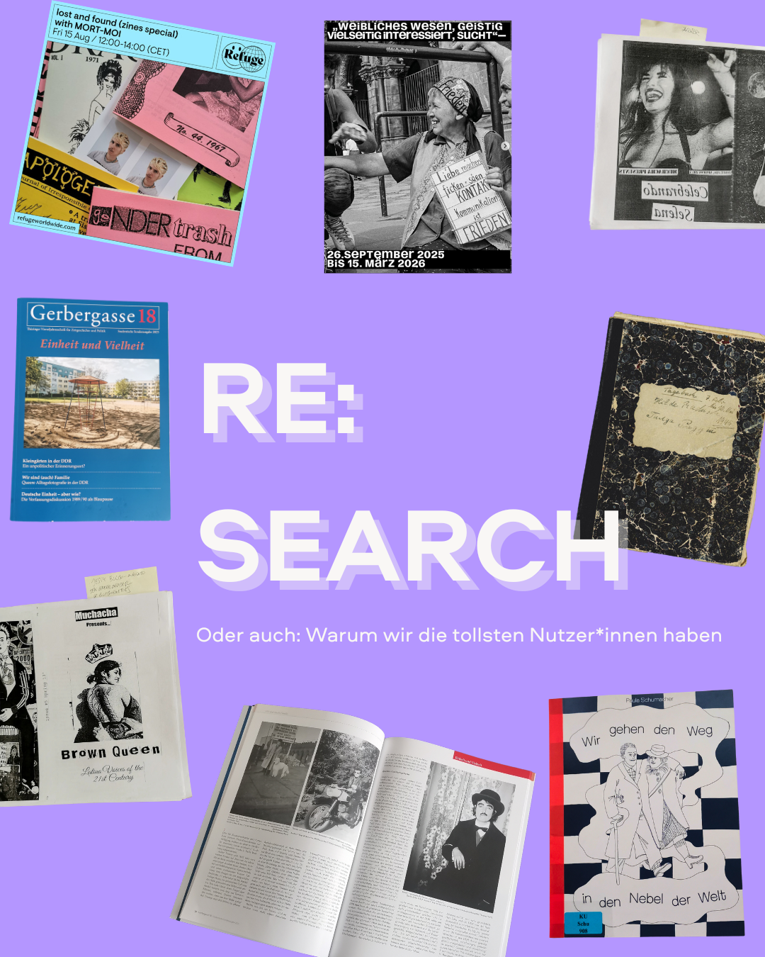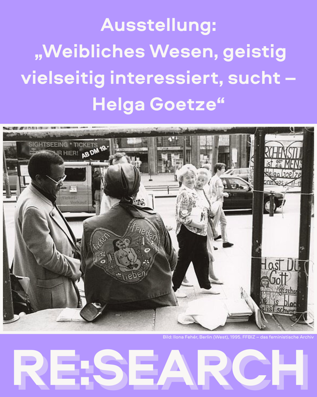 2025 hat das FFBIZ das digitale Projekt “RE:SEARCH” ins Leben gerufen: Auf unseren Social Media-Kanälen machen wir dabei regelmäßig auf kreative, spannende und manchmal überraschende Werke aufmerksam, die aus Recherchen im FFBIZ entstanden sind. Viele Bewegungsarchive wie das FFBIZ sind außerhalb klassischer Wissens- und Hochschulstrukturen entstanden und arbeiten daher mit weniger standardisierter Archivpraxis. Diese alternative Form der Erinnerungsarbeit spiegelt sich auch in den Materialarten wider: Die Bestände umfassen neben klassischen Archivaliengattungen wie Fotos, Plakaten, Film und Tonaufnahmen auch zahlreiche Objekte, eine Button- und Stickersammlung und die “Grauen Materialien”, wie Flyer oder Programmhefte. Gerade diese Vielfalt kann Nutzer*innen zahlreiche Zugänge eröffnen und ermöglicht nicht nur wissenschaftliches, sondern auch aktivistisches, künstlerisches oder interaktives Arbeiten mit den Materialien. Einmal pro Woche präsentiert das FFBIZ Beispiele dafür auf Social Media.