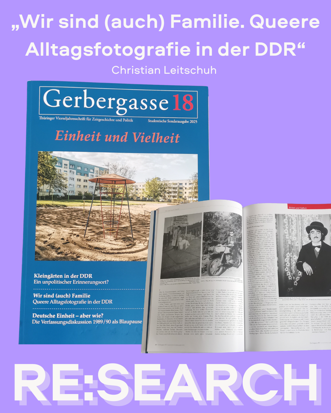 Auch das das Kapitel „Wir sind (auch) Familie. Queere Alltagsfotografie in der DDR“ von Christian Leitschuh in der Zeitschrift “Gerbergasse 18” soll hier nicht unerwähnt bleiben. Leitschuh analysiert darin die sozialistische Familienpolitik der DDR im Spannungsfeld alternativer Formen des Zusammenlebens ausgehend von der Hundefriseurin, Hobbyfotografin und lesbischen Veranstaltungsorganisatorin Rita „Tommy“ Thomas.