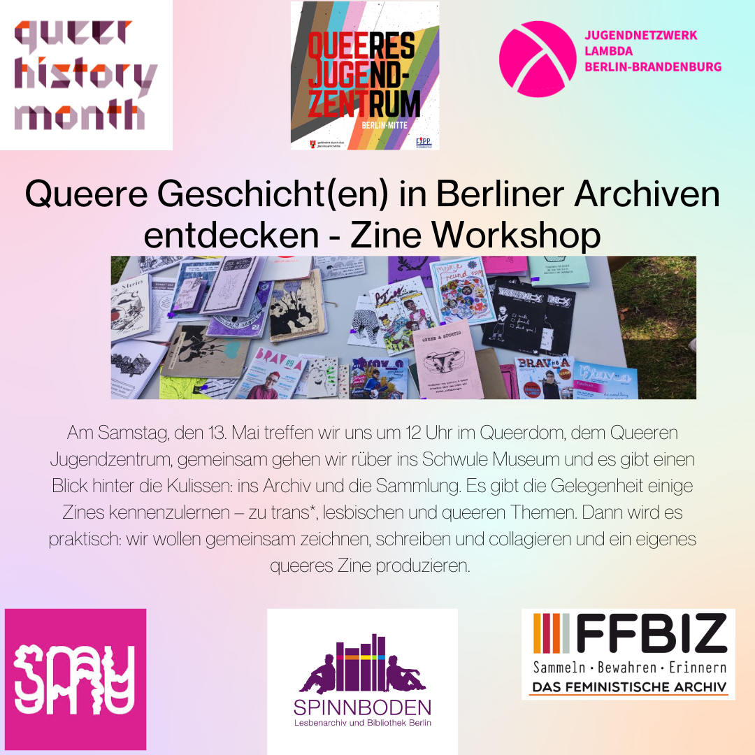 Im Rahmen des Queer History Month veranstalten wir gemeinsam mit dem Spinnboden Lesbenarchiv, dem Schwulen Museum, dem Queeren Jugendzentrum Berlin-Mitte und dem Jugendnetzwerk Lambda Berlin-Brandenburg eine Workshop-Reihe unter dem Titel „Queere Geschichte(n) in Berliner Archiven entdecken“.