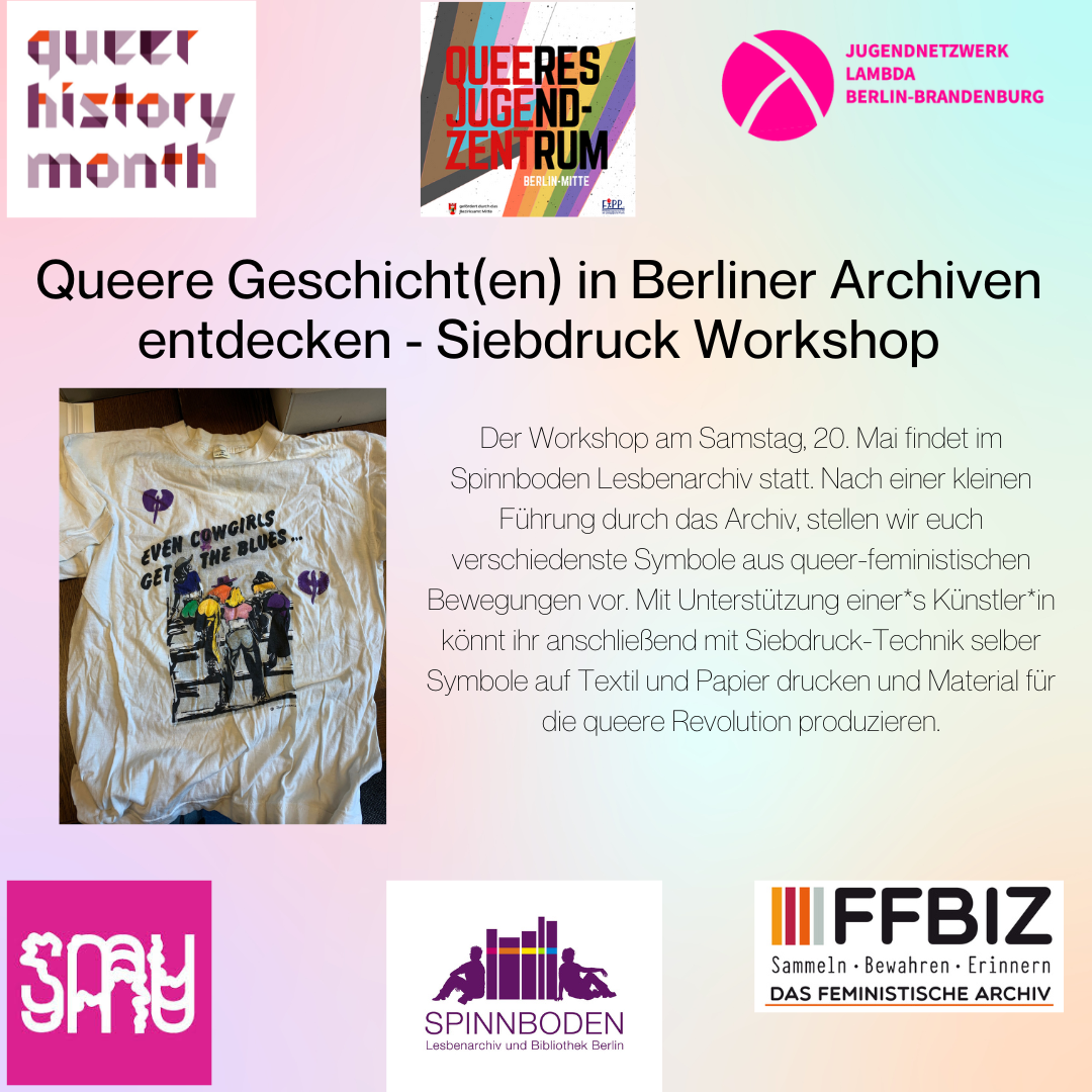 - Samstag, 20. Mai, 12-18 Uhr: Siebdruck-Workshop im Spinnboden Lesbenarchiv
