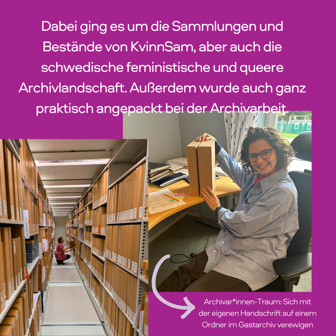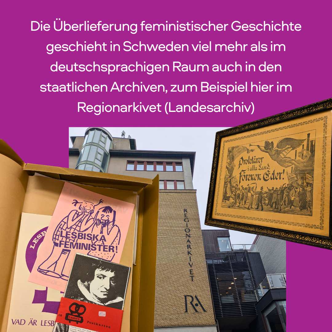 KvinnSam ist das zentrale feministische Archiv in Schweden und schon seit den 1970er Jahren Teil der Universitätsbibliothek in Göteborg. Das Archiv ist personell im Vergleich sehr gut ausgestattet, aber das einzige seiner Art in Schweden. Die Kolleg*innen bei KvinnSam können die Infrastruktur und Ressourcen der Universitätsbibliothek mitnutzen und so kann man dort vieles Lernen, zum Beispiel über Bestandserhaltung oder den Umgang mit Schädlingen wie Papierfischchen (gruselig!).
